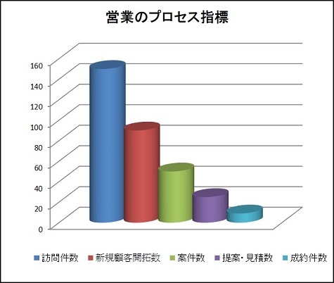 BSCの意図するレベル感とはやや異なるところもありますが、営業でよく使われる行動KPI(プロセス指標)の例としては、訪問件数、新規顧客開拓数、案件数、提案・見積数、成約件数などが挙げられます。