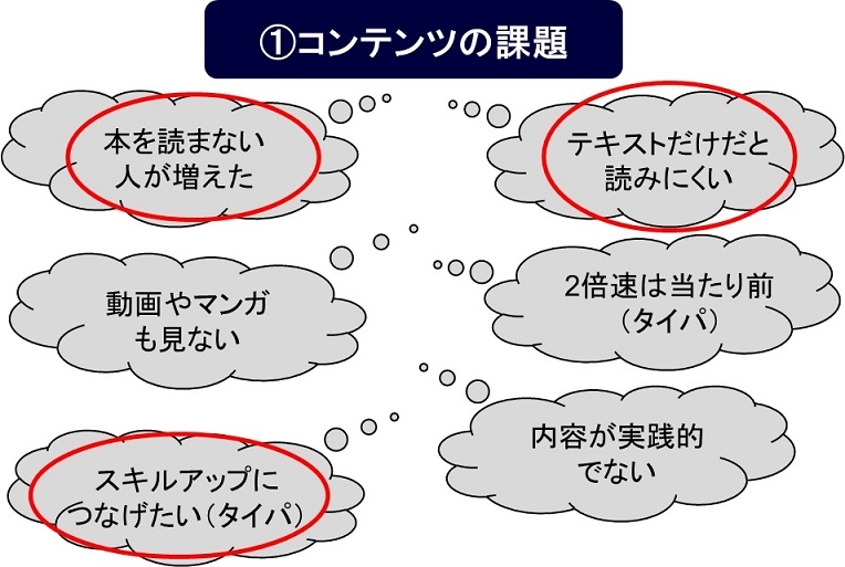 ✔ 教育コンテンツはテキスト中心だが、本を読まない人が増えた